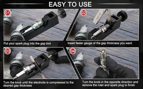 - How to Use -- Place your spark plug into the gap tool, insert feeler gauge of the gap thickness you want and turn knob until the electrode compressed to the desired gap thickness.