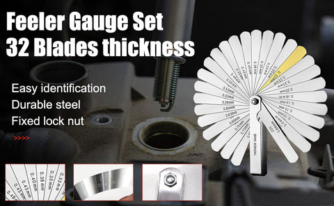 - Foldable Feeler Gauge -- Made of 65 manganese steel, each feeler gauge has 32 blades with dual metric and imperial markings and are engraved on the feeler gauge for easy identification, 0.0015 inch/ 0.04 mm to 0.035 inch/ 0.88 mm. With a lubricant coating to prevent pitting and corrosion.