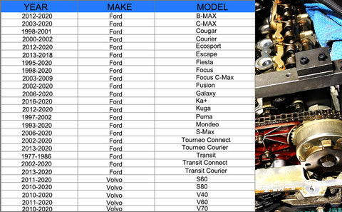 - ✔ Camshaft Alignment Tool Compatibility -- Ford 1.6 Ti-VCT, 1.5/1.6VVT ECOBOOST, S-Max, Mondeo, B-MAX, C-MAX 1.6 VCT-Ti(03-09), Focus, Fusion, Fiesta, Escape, Galaxy, Kuga, Ka+, Transit, Tourneo Connect, Transit Connect, Transit Courier, Mazada MPV, Mazda Tribute and for 1977 to 1986 Ford Transits.