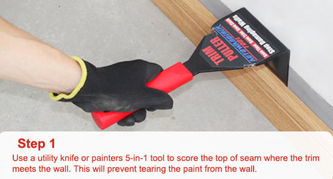- WIDE PRY BLADE -- The sharp leading edge not only gets between the wood and the wall easily, it also smoothly separates out small pieces of stubborn caulk that are missed by pre-cutting with the blade, which really helps to get started.